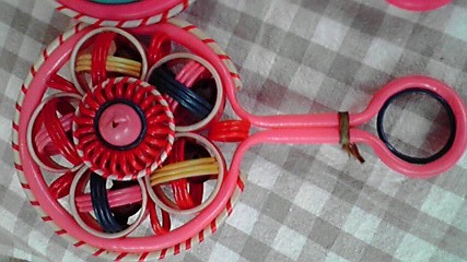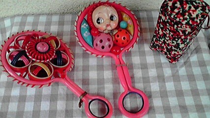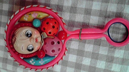 セルロイドのガラガラです。ベースの色はいかにもセルロイドといった感じのピンク。 (昭和20~30年代 ) 縦23 横13cm