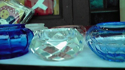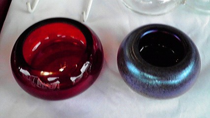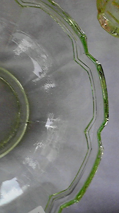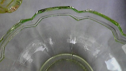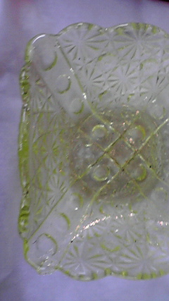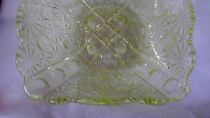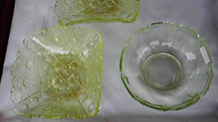 ウランガラスの器。 左側は外国製。縦・横12.3cm 2枚あり。右 直径11cm 各¥4500 黄色いほうは、かなり光ってます。