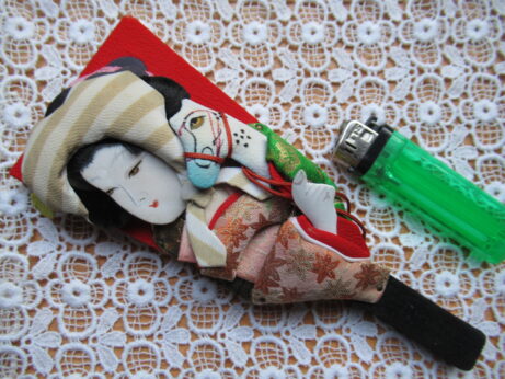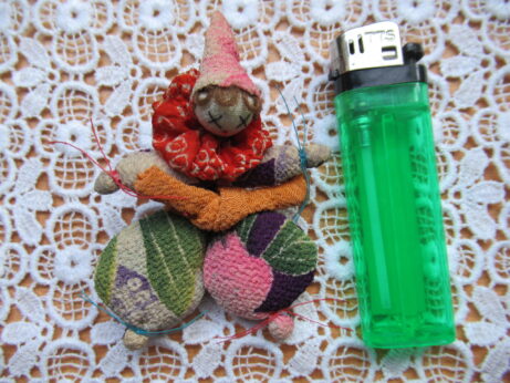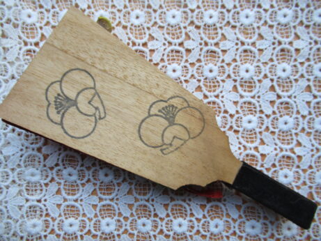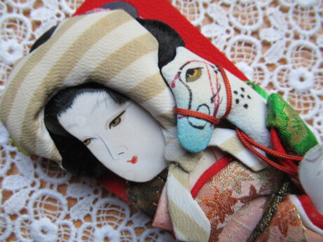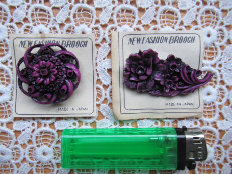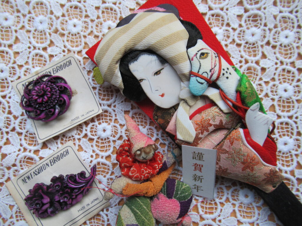 小さな飾り羽子板(Z-686)¥1800 縦18.5cm 額と頬にうっすらとシミあり。 布製人形ブローチ(Z-685)¥2500 縦8.5cm セルロイド・ブローチ 2点 デッドストック ブローチ (Z-684)¥1500 直3.5cm ブローチ (Z-683)¥1500 横5.5cm
