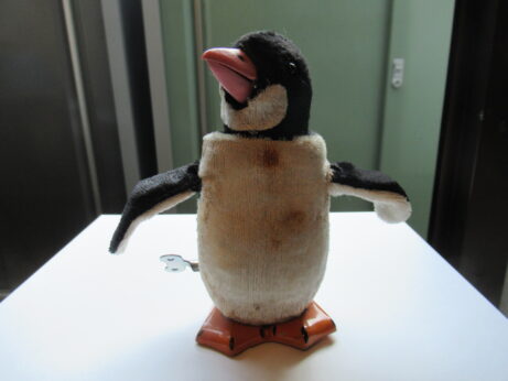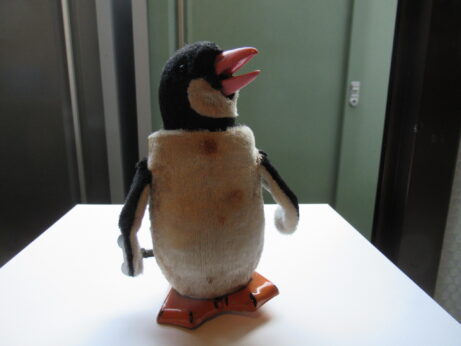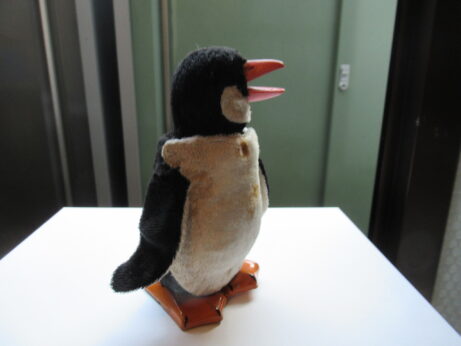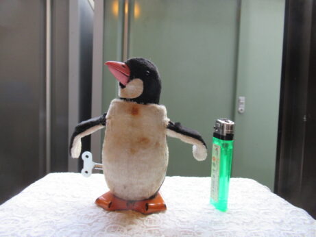 モール人形(N-1177)¥1800 高13cm モール人形 左(N-1175)¥1200 高11cm 右(N-1176)¥1000 高8cm ゼンマイおもちゃ・ペンギン(N-1174)¥12.000 高14cm シミがあります。 前に進みながら、羽は上下に。クチバシが開き頭をふります。
