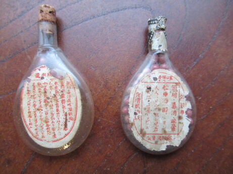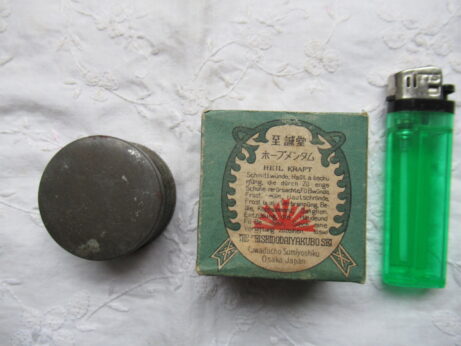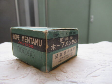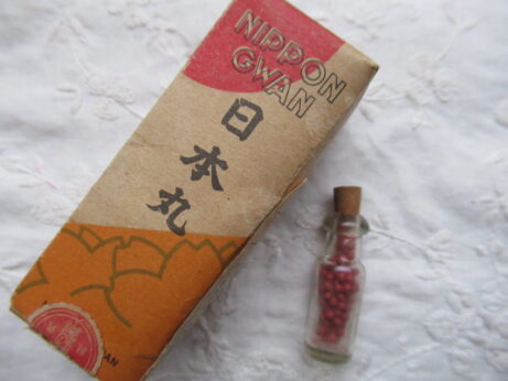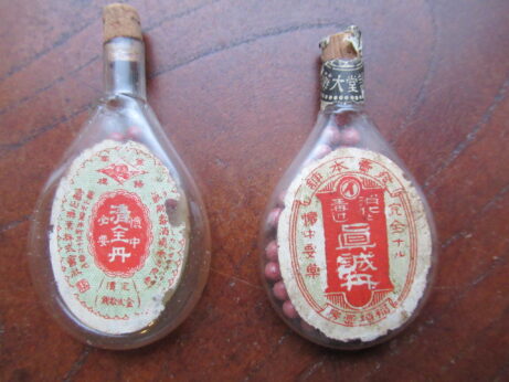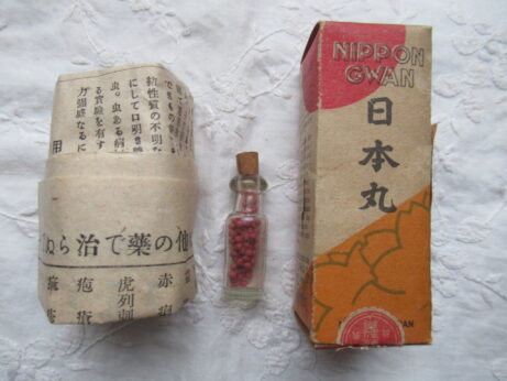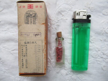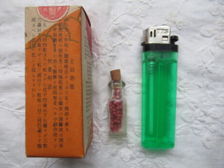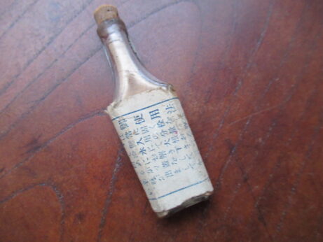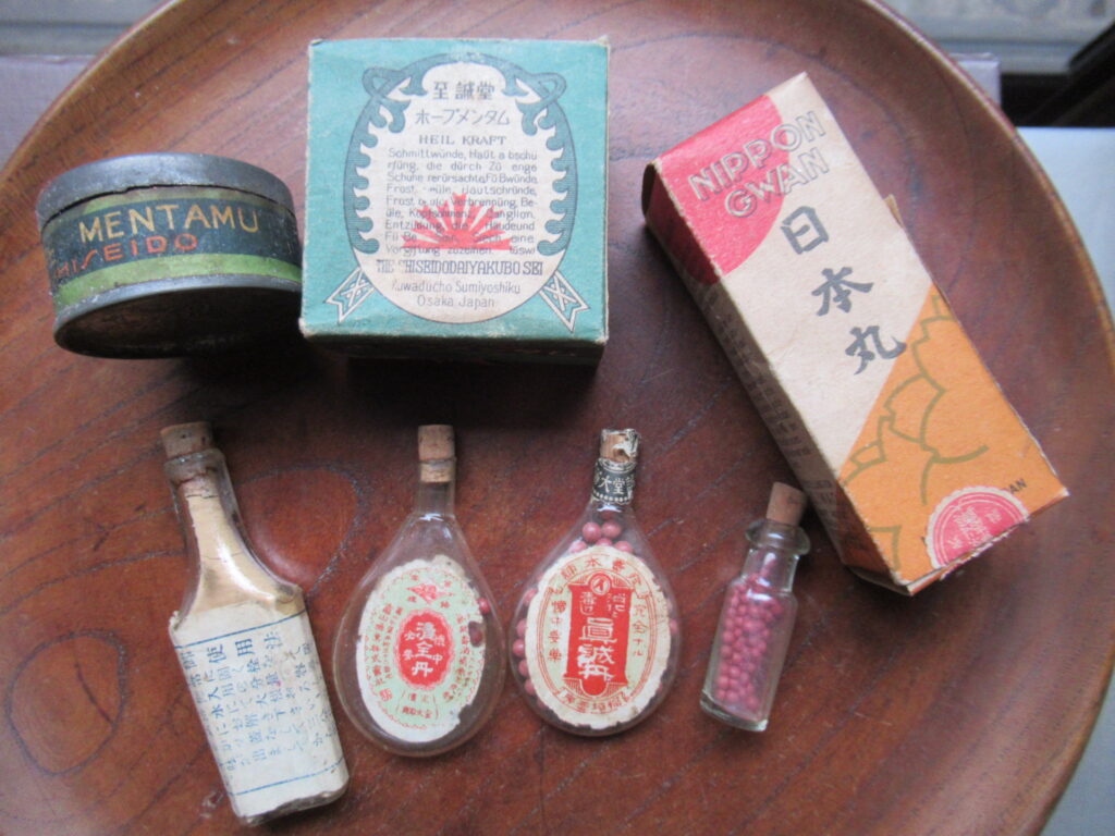 日本丸(KU-154)¥2500sold 未開封 説明書付き 瓶の大きさ・3.8cm ホープメンタム(KU-153)¥1500 未開封 缶・直径4.3 高2.5cm 左・清全丹(KU-151)6cm 右・真誠丹(KU-152)5.3cm 各¥15002個ともsold 裏側 小型バチ瓶(KU-150)¥1500 高7cm 中身は粉からしのようです。