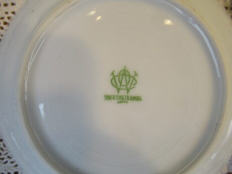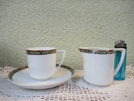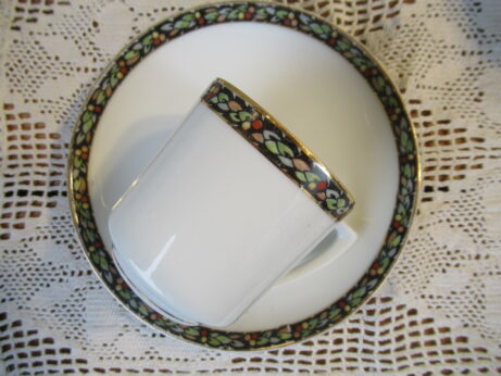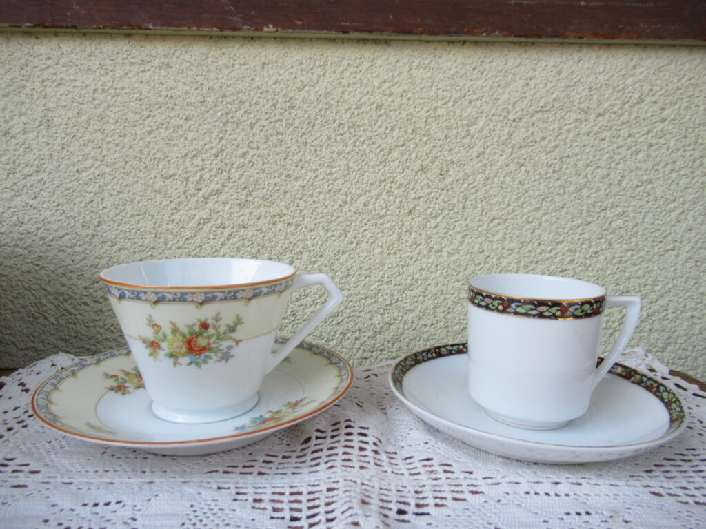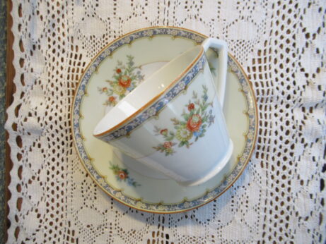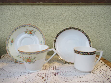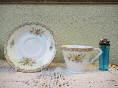 東洋陶器 カップ&ソーサーとピッチャー 右・ピッチャー(A-96)¥1800 高6.5cm デミタスカップ&ソーサー(A-95)¥2200 カップ・口径5.5 高6cm ソーサー・直12.5cm 裏印 大正期 ノリタケ・カップ&ソーサー(A-94)1客¥2500 在庫2個 カップ・口径8 高6cm ソーサー・直13.2cm 裏印 1935〜1943年