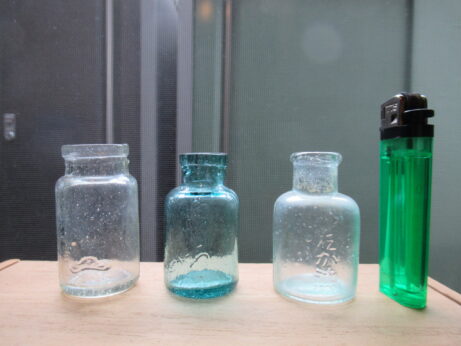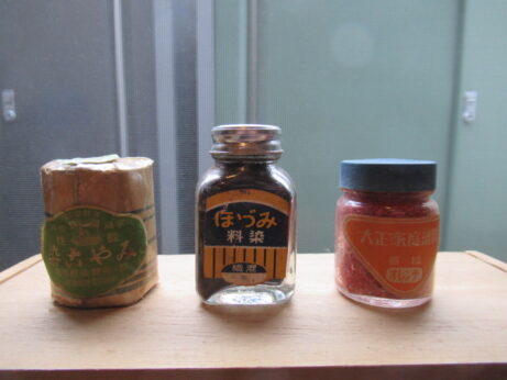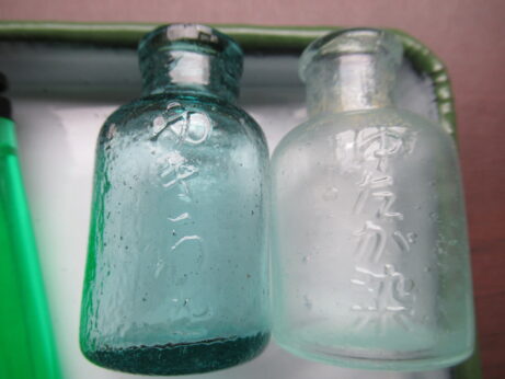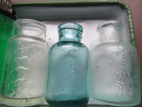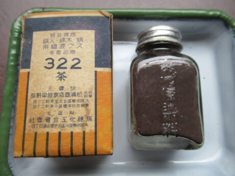 未開封・染料3点 戦前・みやこ染め(Z-706)¥1500 高4.5cm 緑色 みづほ染料(Z-705)¥1500 高5.8cm 説明書、付いています。 茶色 大正家庭染料(Z-704)¥1000 高4.6cm オレンジ色 箱の上蓋、ありません。 戦前・染料瓶3本 各¥1500 左・ゆきわ染(Z-702) 右・ゆたか染(Z-703) 高6cm マツ染料(Z-701) 高6.2cm