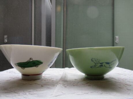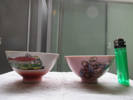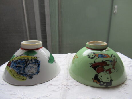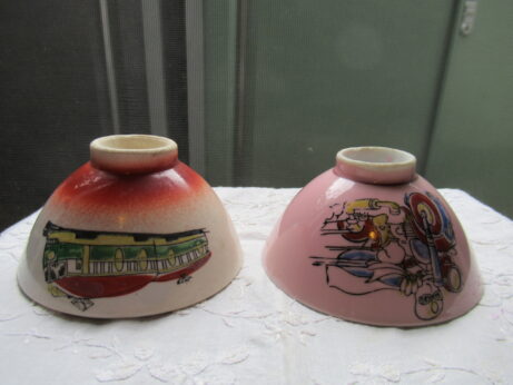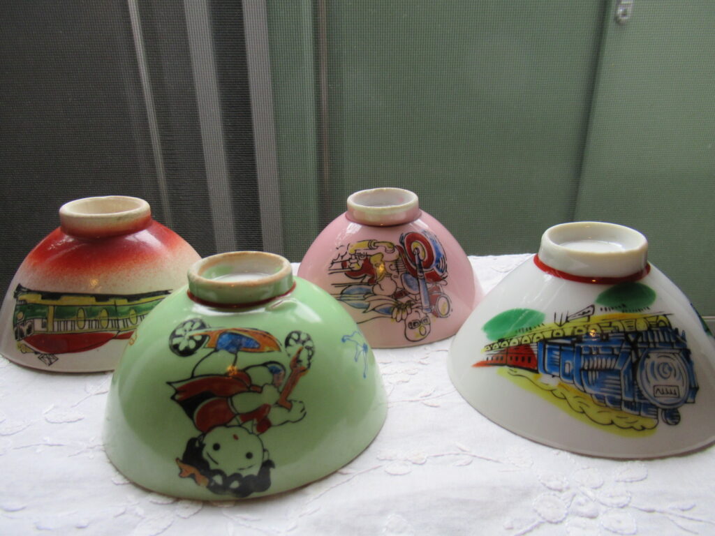 左・電車(Z-709)¥1800 口径9.5 高5.3cm 右・月光仮面(Z-710)¥2000 口径9.8 高5cm 反対側 月光仮面も方。内キズあり。 左・汽車(Z-707)¥1500 口径10 高5cm 右・クルミちゃん(Z-708)¥2500 口径9.5 高5cm 反対側