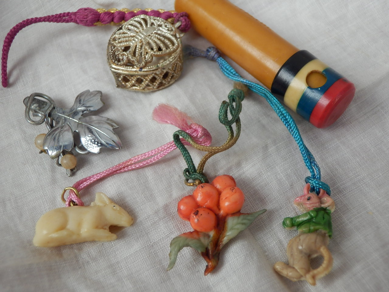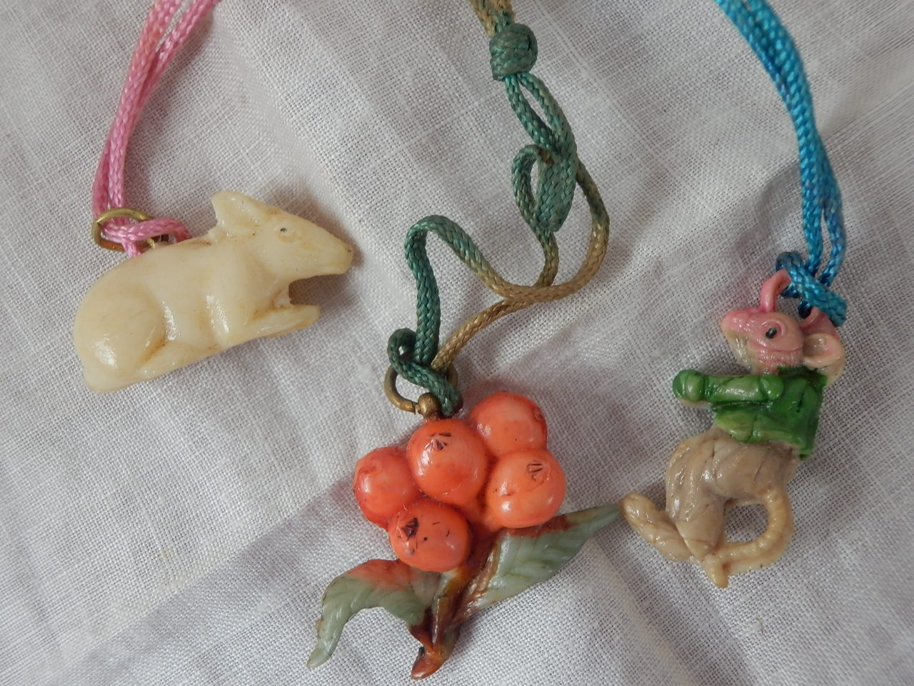 根付け 左・ねずみ(Z-94) 中・びわ(Z-95) 右・ねずみ(Z-96) 各¥1000 2〜2.5cm位 古いセルロイド製