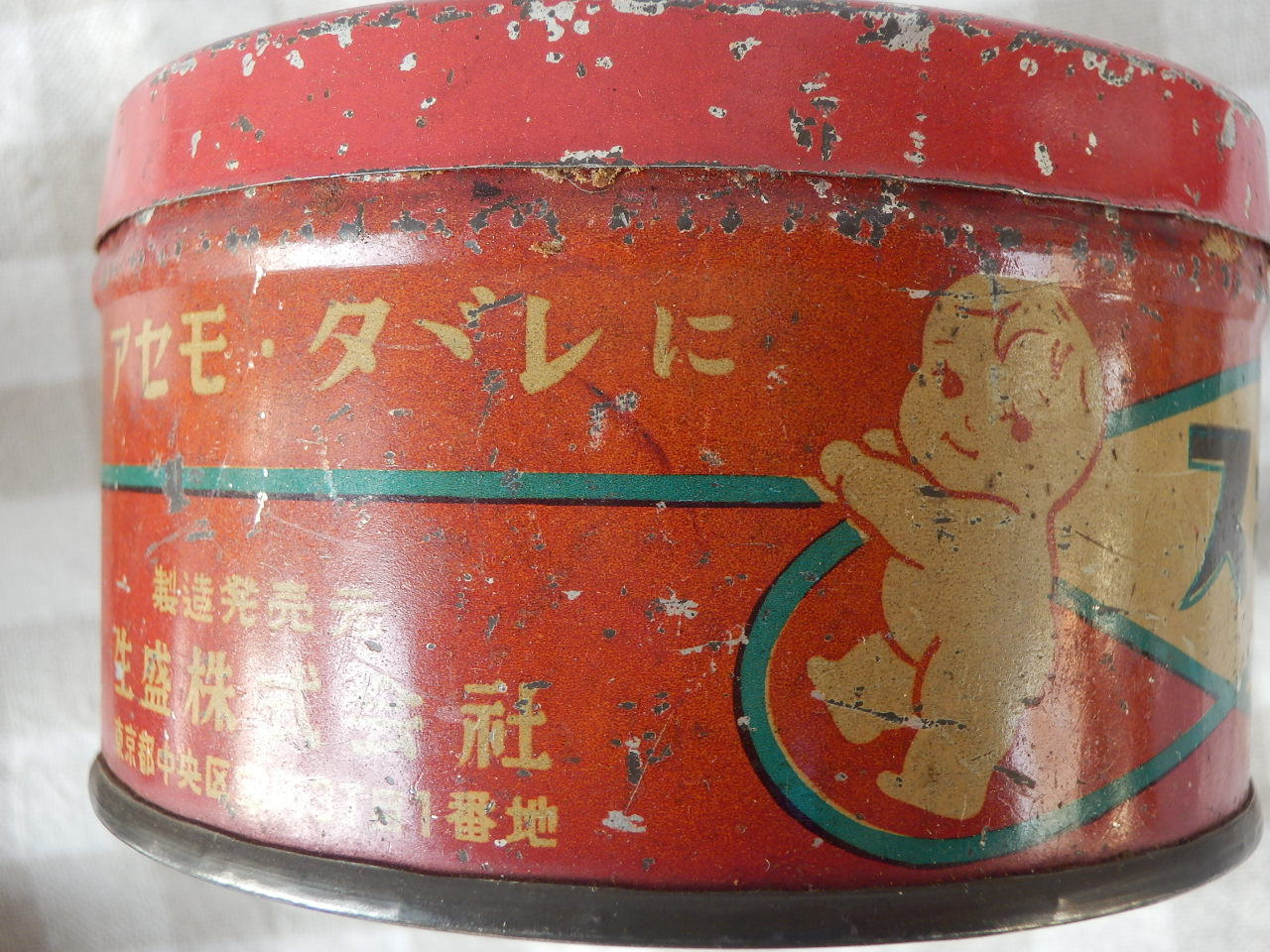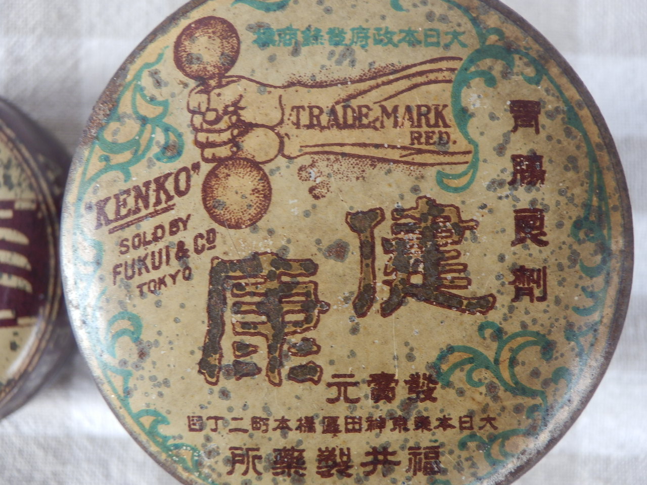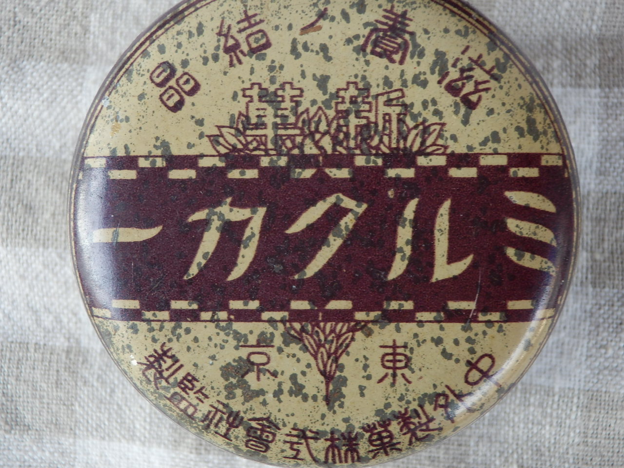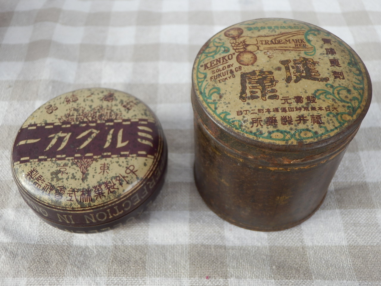戦前の缶 左・ミルクカー(J-167)¥1000 直径5.5 高2.5cm 右・健康(J-168)¥1000 直径5 高5.5cm