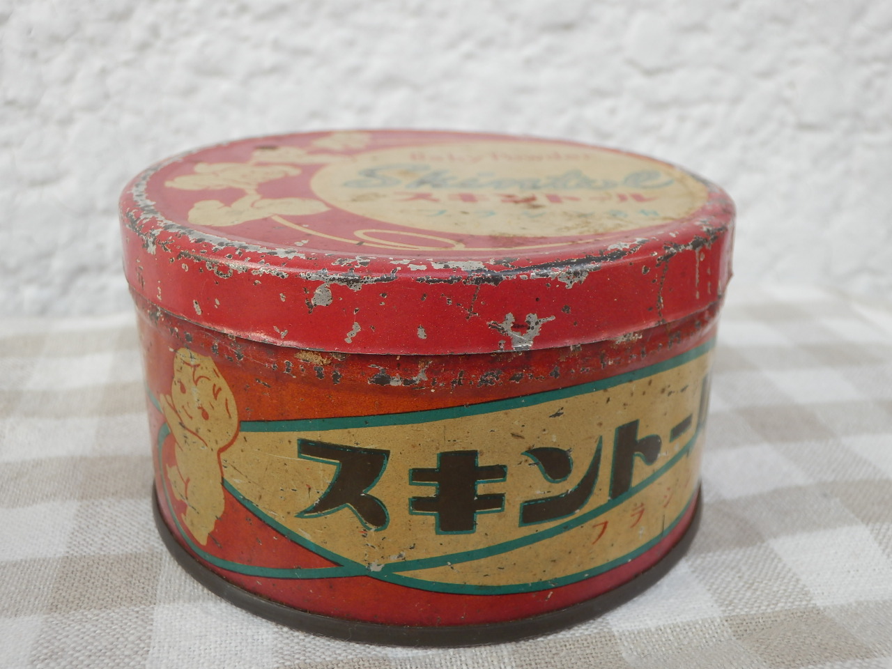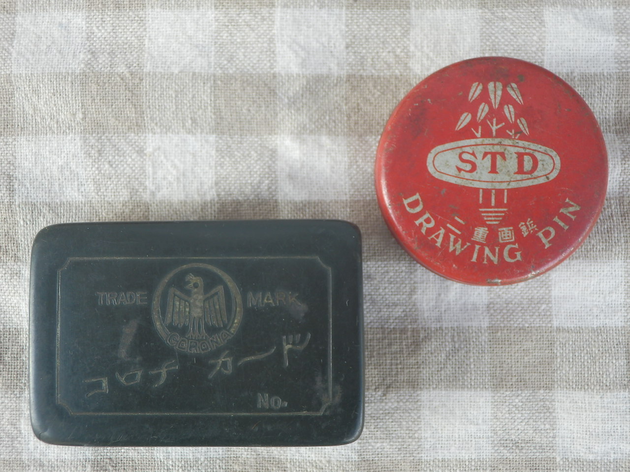 左・セルロイド・カードケース(J-169)¥1000 4×6cm 右・画鋲缶(J-170)sold 直径4.2cm