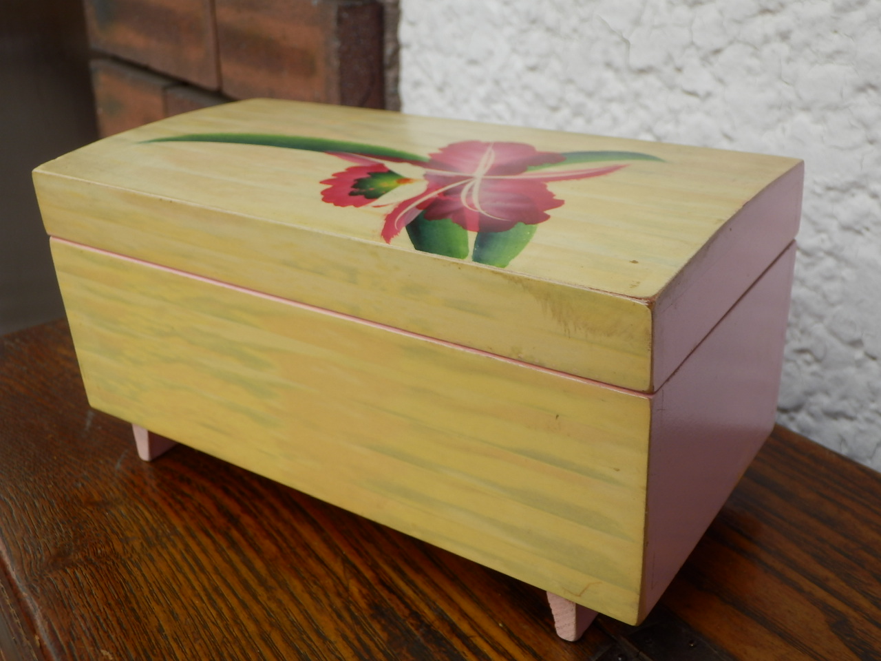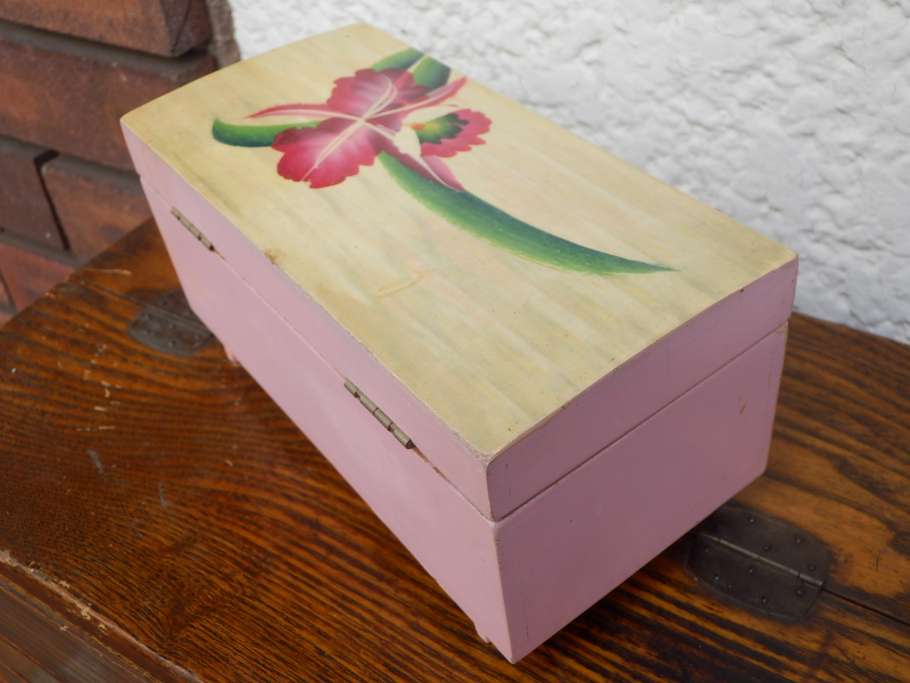 木製の箱にカトレアの絵…… 昭和の雰囲気