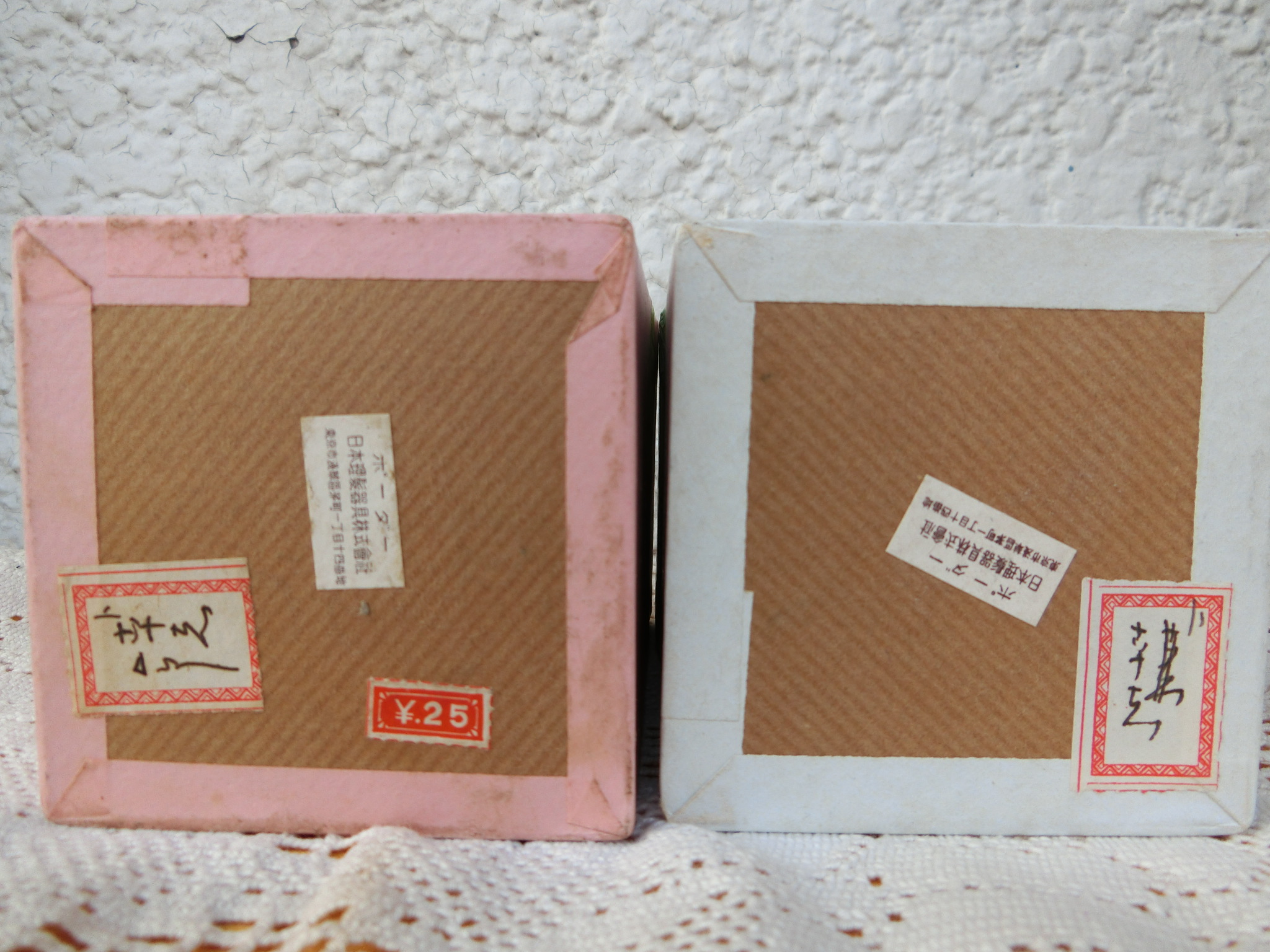 戦前・未使用 左・ピンク(K-63) 右・白(K-64) 各¥3000 箱の大きさ 7.4×7.4 高11.2cm 「TALCUM POWDER」…..ひげそり後や汗止めに使用するパウダー