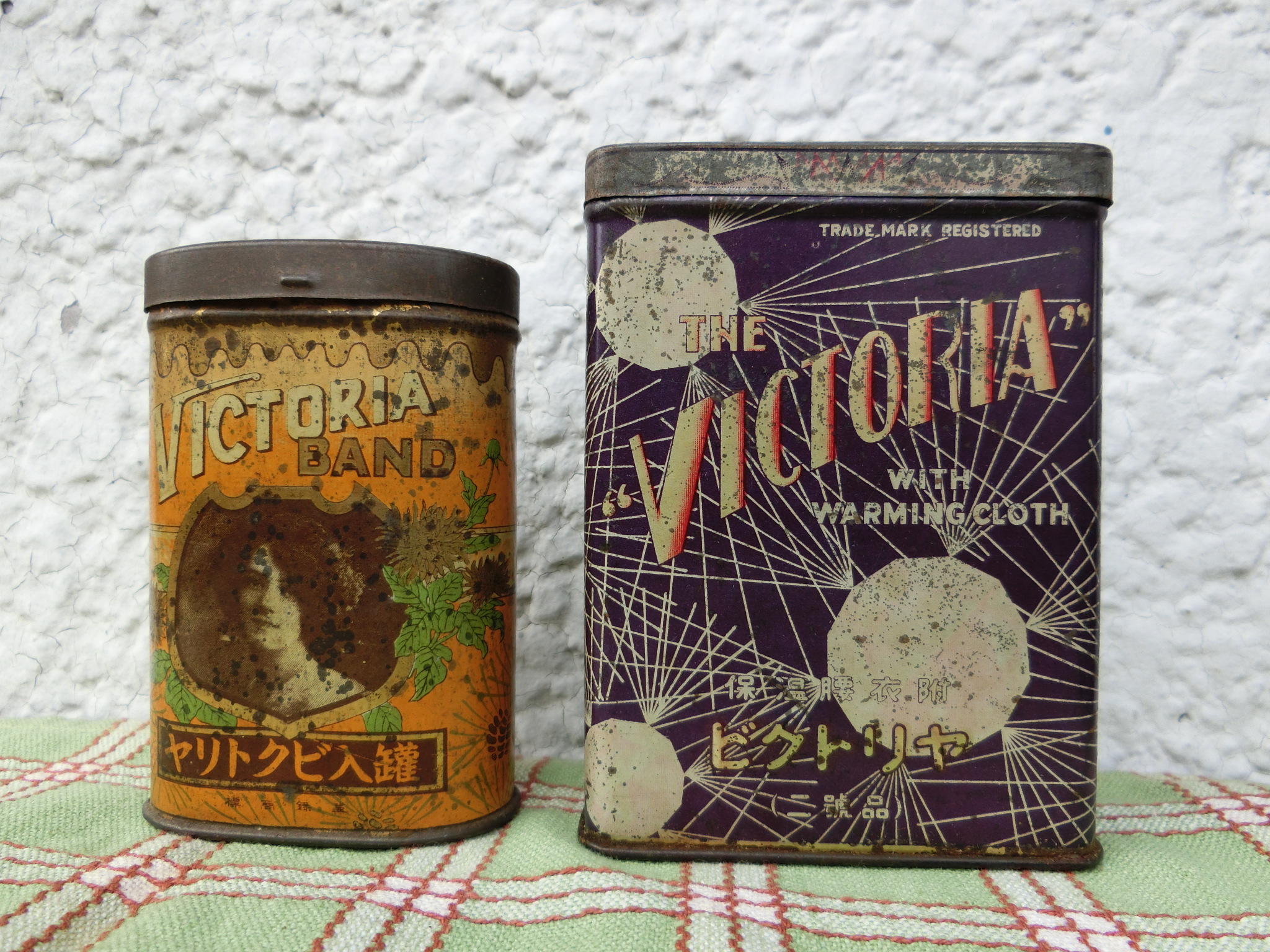 左(J-336)¥1000sold 3.5×6 高9cm 右(J-337)¥1000sold 3.5×7.2 高10.2cm 裏側 月経帯・ビクトリヤの缶