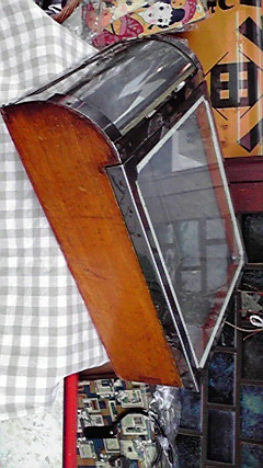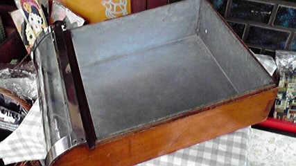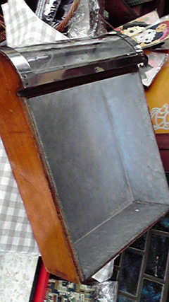 しっかりとした商品ケース。木の色が年代を感じさせます。(SK-0)sold 縦 33.5 横45.5 高14.5cm 前のガラスの様子。 蓋をずらしたところ 蓋を取ったところ…..結構いろいろ入りそう。