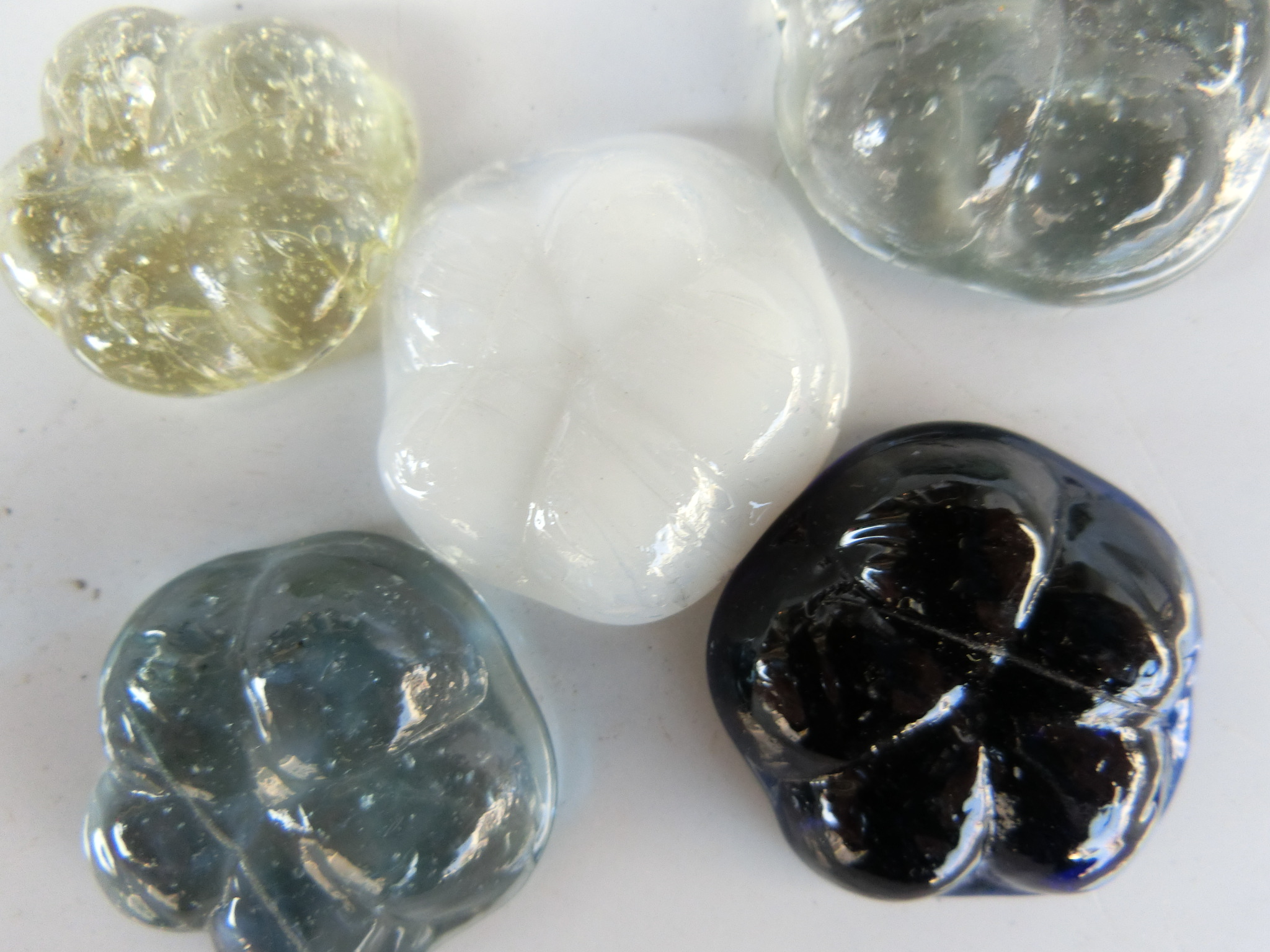 ガラスおはじき 梅型(G-139)¥3800sold 5色セット・薄い青、藍、飴色、白、透明 直径2cm位