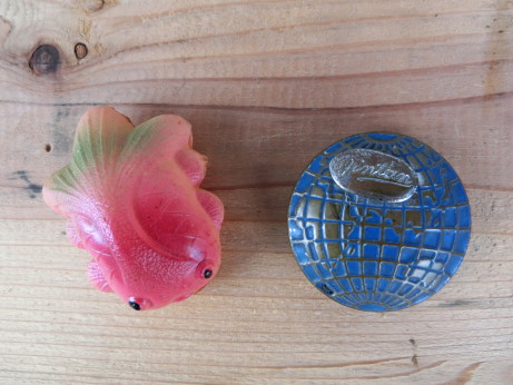 左・セルロイド金魚(J-247)¥1800 3×4.5cm 右・仁丹ケース(J-248)¥3500 sold 直径3.5cm