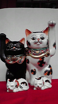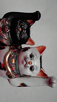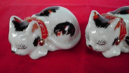 九谷焼きの猫・招き猫….黒と三毛がくっついています!(MN-4)最高26 最巾22cmsold(¥28000) 足元にいるのは眠り猫。(MN-5)縦5 横8cm 各¥3500sold