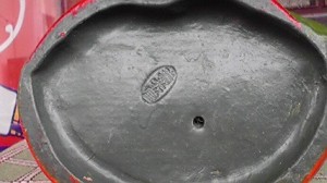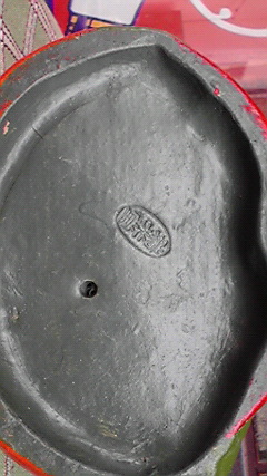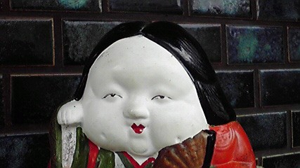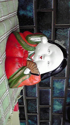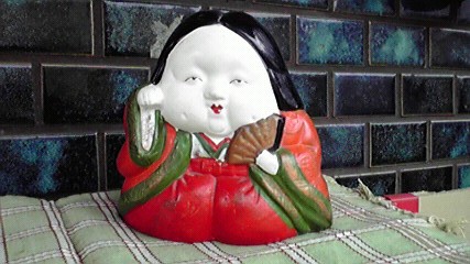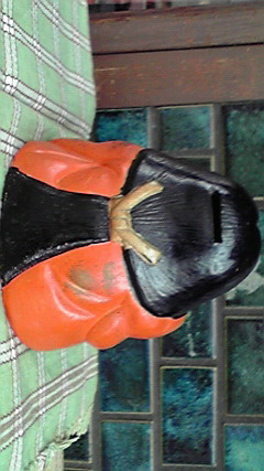 お多福さんの貯金箱です。(OT-1)sold 底・横15cm 高15 奥ゆき11cm (中に何か入っているようで….ガラガラ音がします) 「いらっしゃ~い」手招きしてます 後ろ姿 裏印・「瑞光堂」と書かれています
