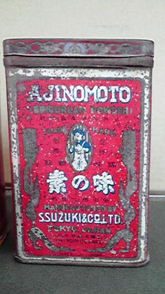 お母さんのマークが懐かしい「味の素」の缶。 右は戦前のレアものです。¥4500 (横9cm×高14cm)
