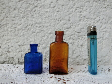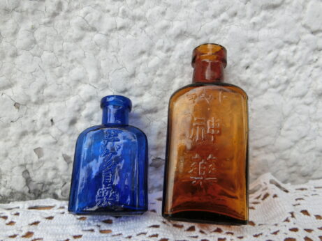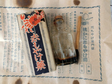 左・井ゲタ目薬(AB-599)¥2500 高 5cm 右・トヤマ 神薬(AB-600)¥6500 sold 高7cm 桃かに 志もやけ薬(AB-598)¥3800 sold 7cm 箱は少し痛んでいます。ハケ、説明書付き。 仁丹ケース(AB-597)¥3000 sold 直径3.6cm ケンビ(AB-596)¥2500 sold 直径6.3cm