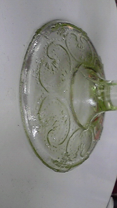 ガラスのコンポート。ウランガラスです。お皿の部分直径14 高10 台・直径8cm (GK-1)¥12000 お皿の模様 台の模様
